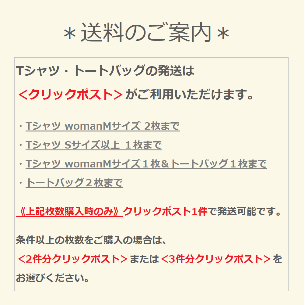 ※クリックポストはサイズ規定がございますので、トートバッグ、TシャツSサイズ以上を合わせて4点以上ご購入の方はヤマト宅急便をご選択ください。